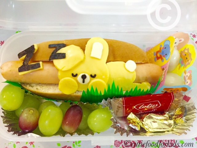 Apart from the bun, I added grapes, quail eggs, a small biscuit and a candy to go along.